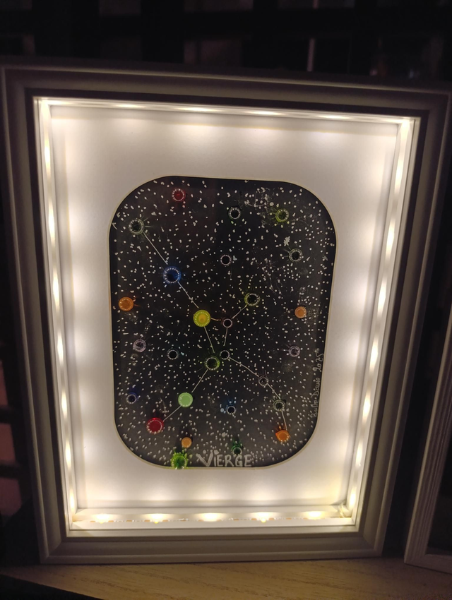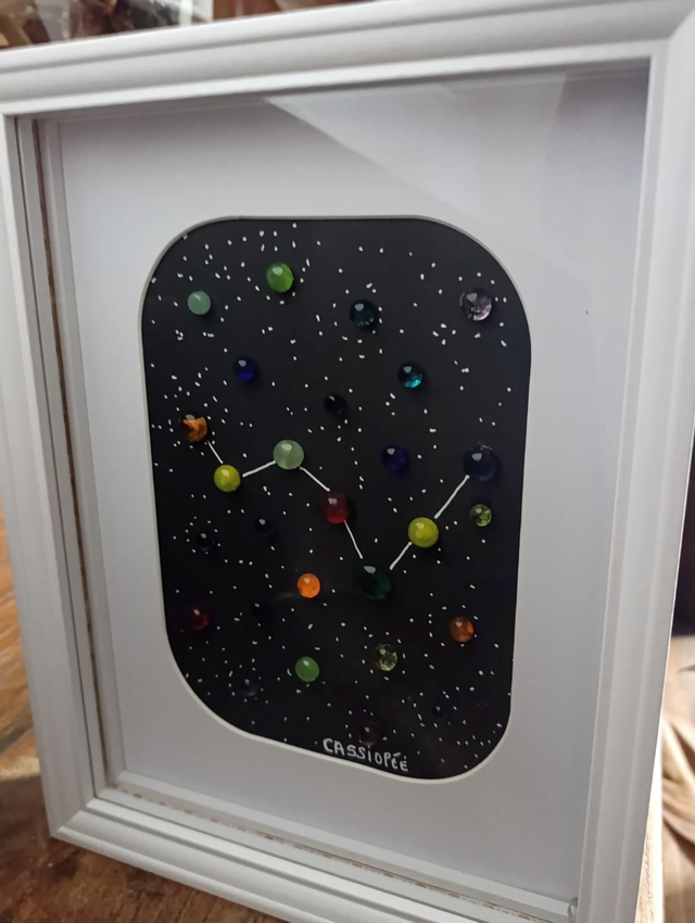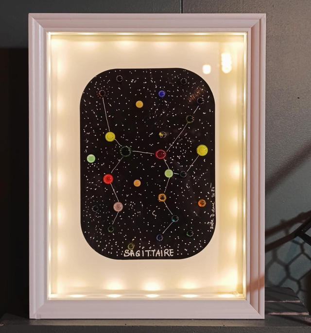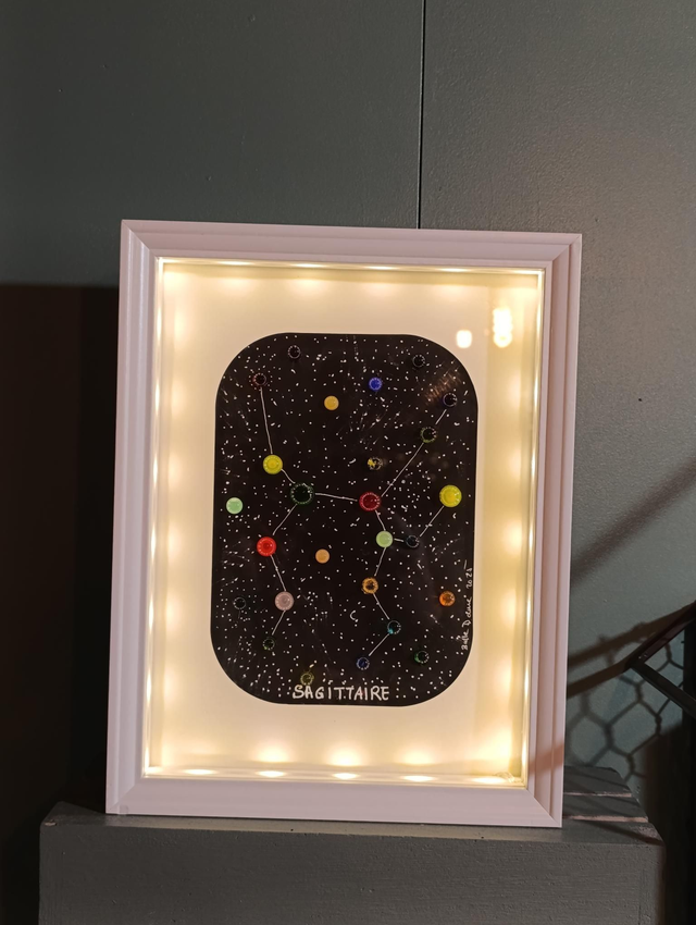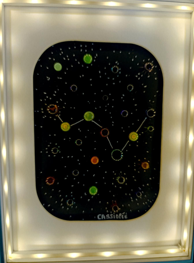 Cadre lumineux 15×20 représentant une constellation en verre filé au chalumeau.